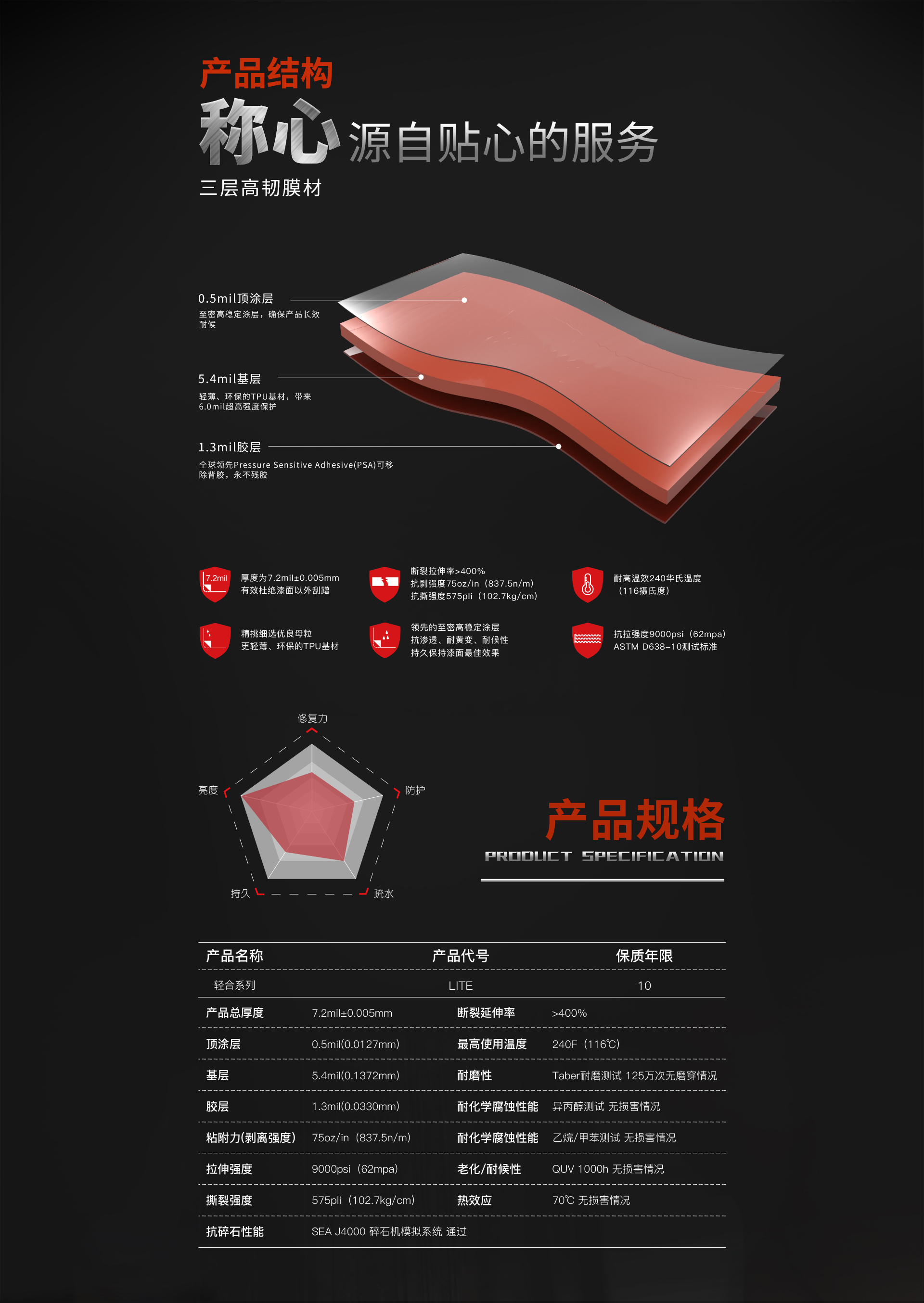 KTM-L系列美国进口TPU材质,厚度9mil,十年质保。防剐蹭、防恶意划漆,有效保护车漆。独有的划痕修复图层,加热漆面划痕自动修复。